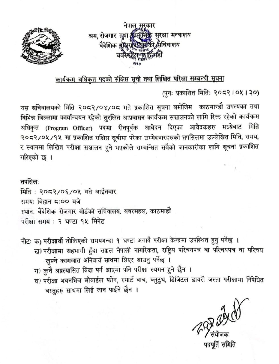 कार्यक्रम अधिकृत पदको संक्षिप्त सूची तथा लिखित परीक्षा सम्बन्धी सूचना