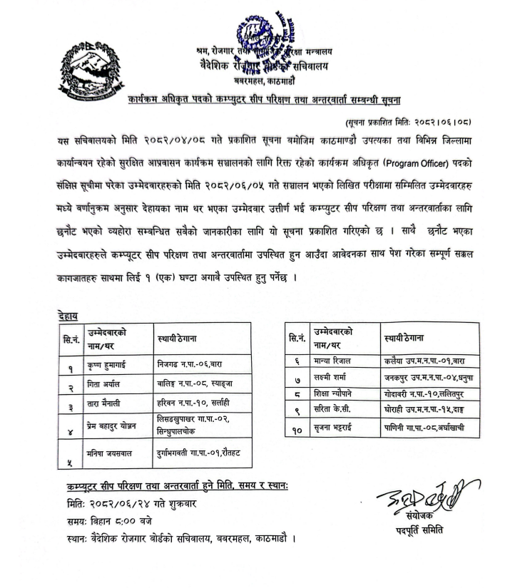 कार्यक्रम अधिकृत पदको कम्प्युटर सीप परिक्षण तथा अन्तरवार्ता सम्बन्धी सूचना
