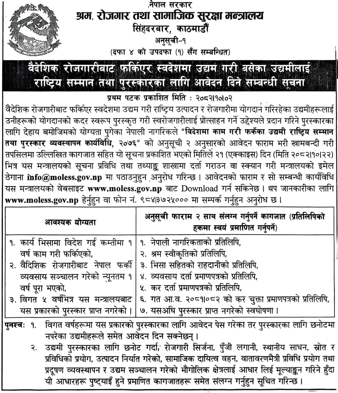 वैदेशिक रोजगारीबाट फर्किएर स्वदेशमा उद्यम गरी बसेका उद्यमीलाई राष्ट्रिय सम्मान तथा पुरस्कारका लागि आवेदन दिने सम्बन्धी सूचना